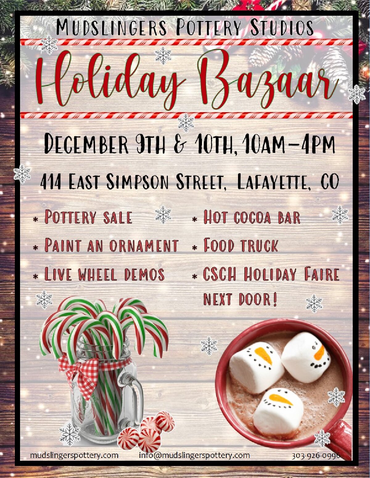 Mudslingers Pottery Studio will be having their 2nd Annual Holiday Bazaar from 10am-4pm on December 9th and 10th. Members of the pottery studio will be selling their handmade pottery, buy ornaments to paint, live wheel throwing pottery demos, food truck, hot cocoa bar and more! We are teaming up with CSCH next door for their annual Holiday Faire as well! Shop small and shop local this holiday season!