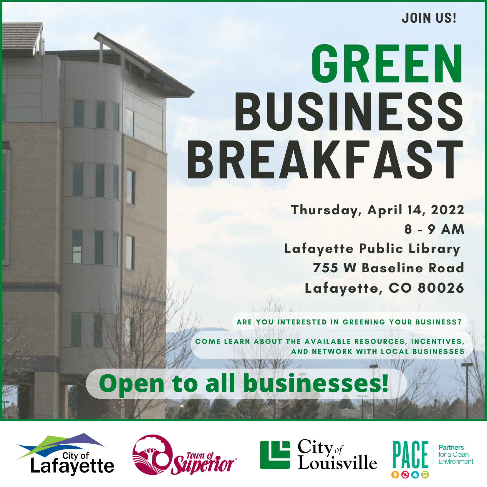 Are you interested in greening your business? The City of Lafayette, Louisville, Town of Superior, and Partners for a Clean Environment invites businesses to learn about local resources, incentives, and network with other businesses.