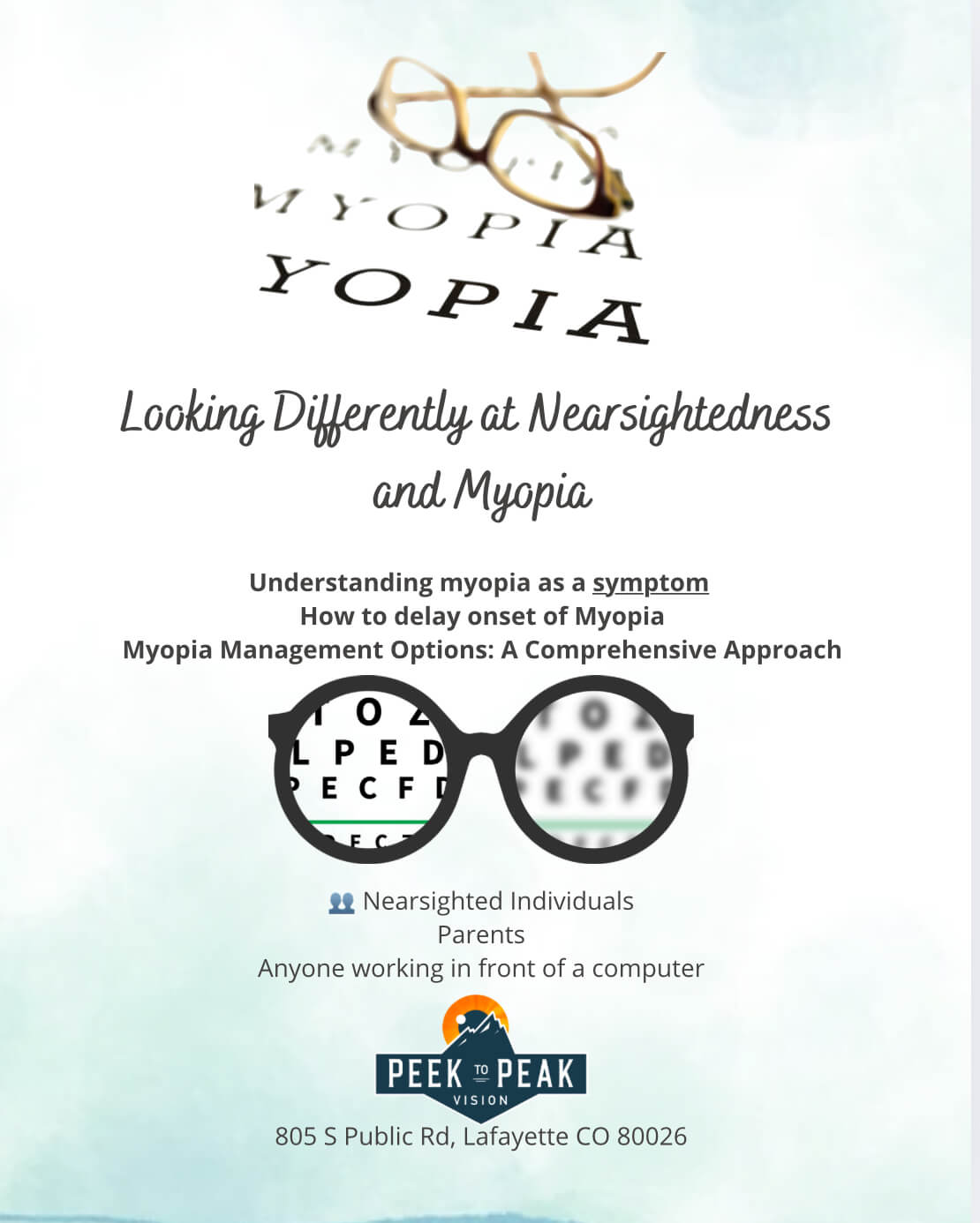 It is projected by 2050 that 50% of the population will be nearsighted. Come hear what management options are available but also hear a different, more functional approach to myopia.