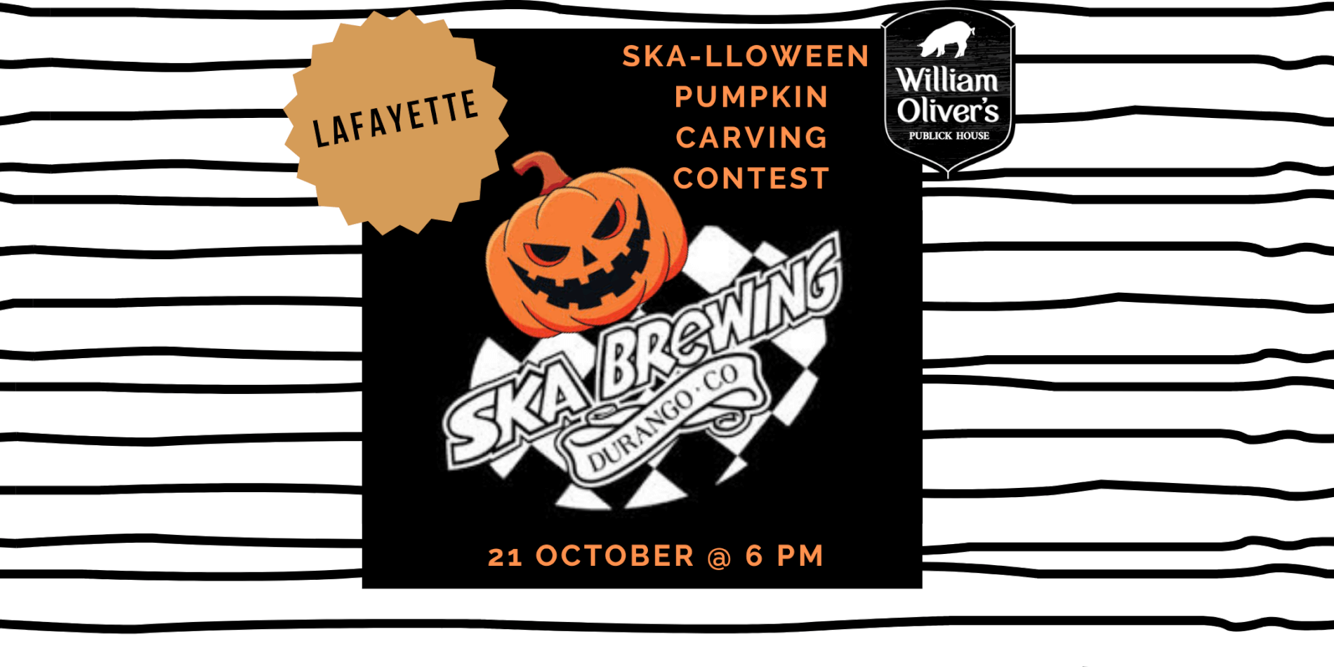 Join us… if you dare! William Oliver’s and Ska Brewing Co. invite you for a hauntingly fun evening of pumpkin carving, chilling drinks, frightfully tasty food, and ghoulish fun. Returning for its third year, our Pumpkin Carving Contest will award a grand prize to the most spellbinding pumpkin of the night. Your ticket includes a Ska beer, your very own pumpkin, and all the carving tools you’ll need to bring your creepy masterpiece to life… if you dare!